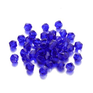 Premium quality Blue 4mm Bi-Cone crystal glass beads available in wholesale pack of 7200 pieces (50 Gross). These faceted spacer beads provide excellent sparkle and are perfect for jewellery making, bracelets, necklaces, earrings, embroidery, and DIY craft projects. Ideal for jewellery designers, craft businesses, and bulk buyers.