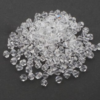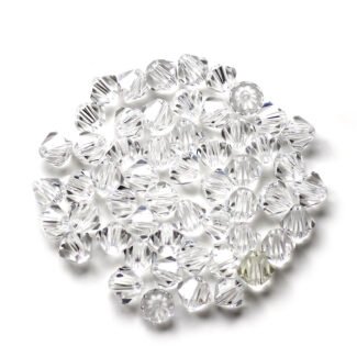 Premium quality 4mm White Transparent, Bi-Cone crystal glass beads available in wholesale pack of 7200 pieces (50 Gross). These faceted spacer beads provide excellent sparkle and are perfect for jewellery making, bracelets, necklaces, earrings, embroidery, and DIY craft projects. Ideal for jewellery designers, craft businesses, and bulk buyers.