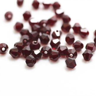 Premium quality 4mm Dark Red Maroon Color, Bi-Cone crystal glass beads available in wholesale pack of 7200 pieces (50 Gross). These faceted spacer beads provide excellent sparkle and are perfect for jewellery making, bracelets, necklaces, earrings, embroidery, and DIY craft projects. Ideal for jewellery designers, craft businesses, and bulk buyers.