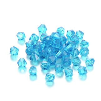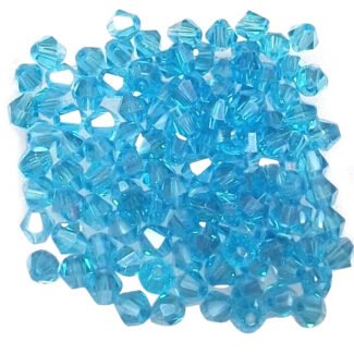 Premium quality 4mm Aqua Blue Bi-Cone Crystal Glass Beads available in wholesale pack of 7200 pcs (50 Gross). These faceted glass spacer beads provide beautiful sparkle and are perfect for bracelets, necklaces, earrings, bead embroidery and DIY jewellery making projects.