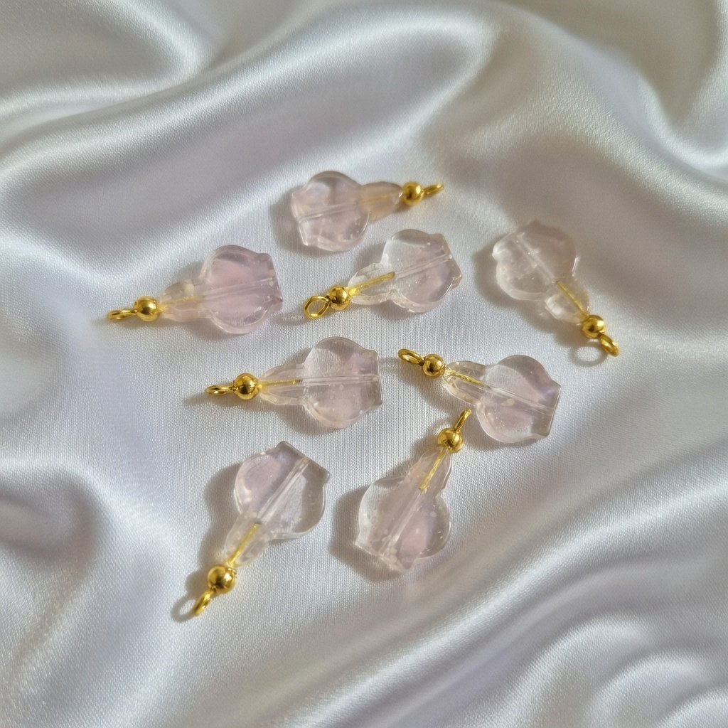 Elegant light pink glass perfume bottle shaped charms featuring a smooth translucent glossy finish and premium gold plated loop, designed for DIY jewelry making and craft projects, soft blush pink tone adds a delicate and feminine touch to designs, lightweight and easy to attach for earrings, pendants, bracelets and necklace creations, approx size 12x21mm perfect for stylish and designer jewelry pieces, high quality glass enhances shine and overall appeal, suitable for handmade jewelry, fashion accessories and creative crafts, sold in pack of 20 pieces for bulk use