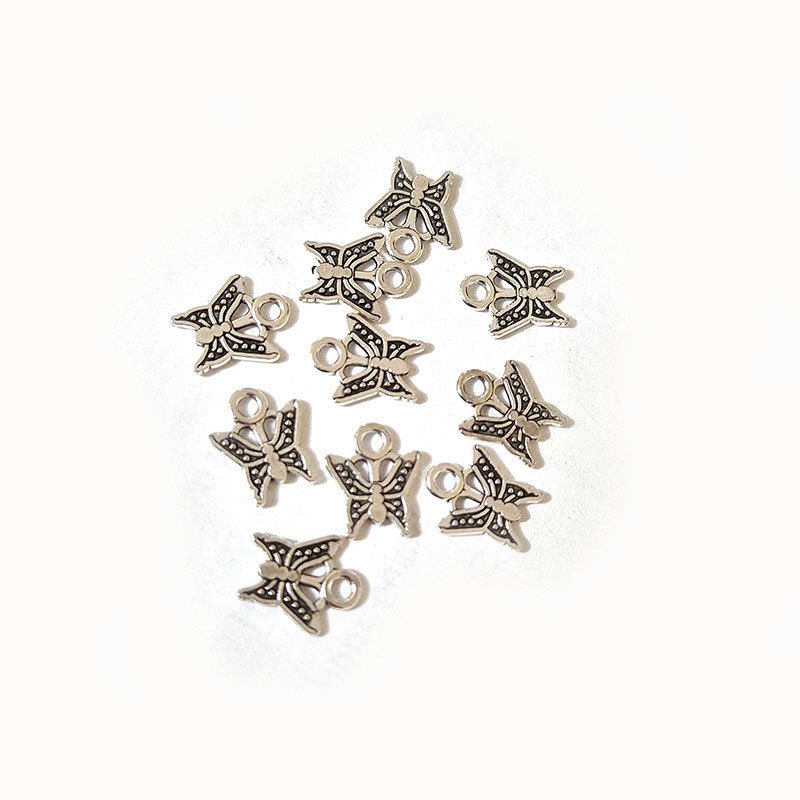 Bring a touch of elegance to your designs with these silver antique small butterfly charms, perfect for jewelry making and DIY crafts. Measuring about 8~10mm, these lightweight charms are ideal for creating earrings, bracelets, necklaces, anklets, and decorative accessories. The detailed butterfly design with an antique silver finish adds a vintage-inspired look, making them suitable for both beginners and professional jewelry designers.