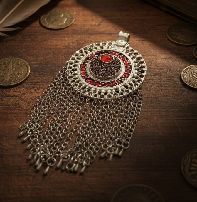 This Antique Silver Tribal Afghan Pendant Replica is inspired by traditional Afghan and nomadic jewelry designs. Crafted with an oxidized silver-tone finish, the pendant showcases intricate tribal patterns that reflect old-world craftsmanship and cultural heritage.