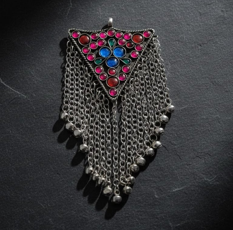This Antique Silver Tribal Afghan Pendant Replica is inspired by traditional Afghan and nomadic jewelry designs. Crafted with an oxidized silver-tone finish, the pendant showcases intricate tribal patterns that reflect old-world craftsmanship and cultural heritage.