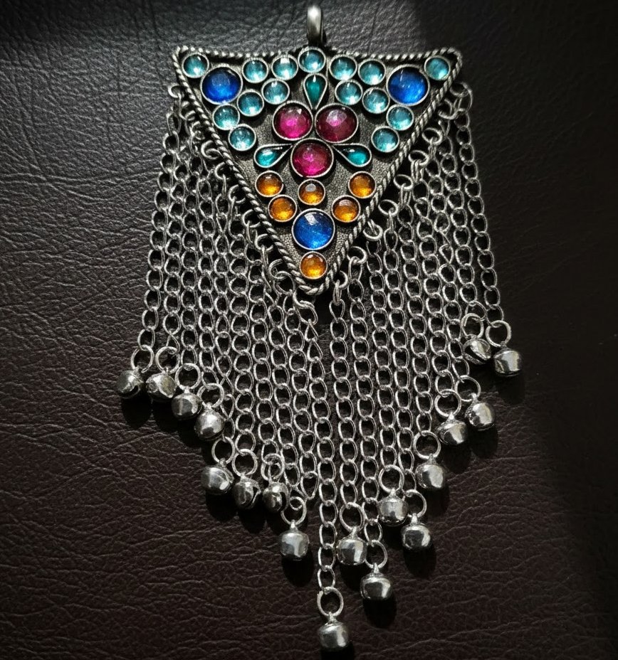 This Antique Silver Tribal Afghan Pendant Replica is inspired by traditional Afghan and nomadic jewelry designs. Crafted with an oxidized silver-tone finish, the pendant showcases intricate tribal patterns that reflect old-world craftsmanship and cultural heritage.