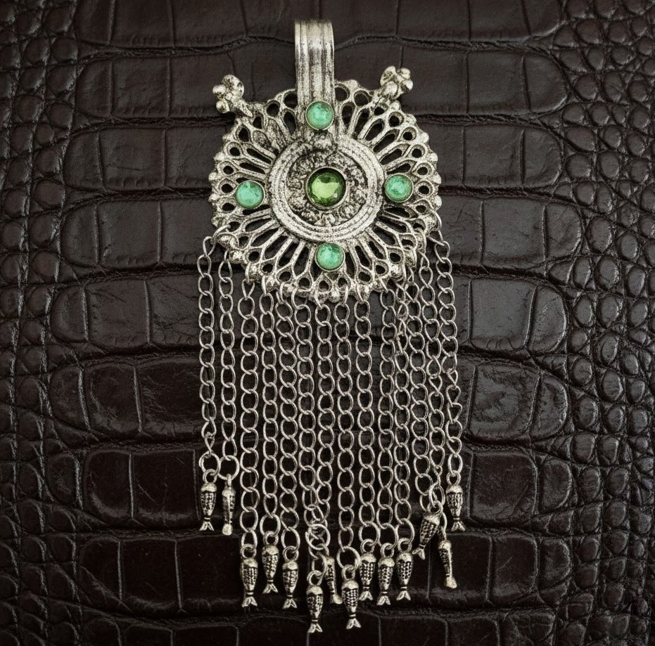 This Antique Silver Tribal Afghan Pendant Replica is inspired by traditional Afghan and nomadic jewelry designs. Crafted with an oxidized silver-tone finish, the pendant showcases intricate tribal patterns that reflect old-world craftsmanship and cultural heritage.