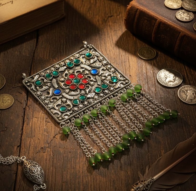 Handcrafted antique silver–finish tribal Afghan pendant replica featuring traditional ethnic detailing. A bold vintage statement piece for boho, tribal, and fusion looks.