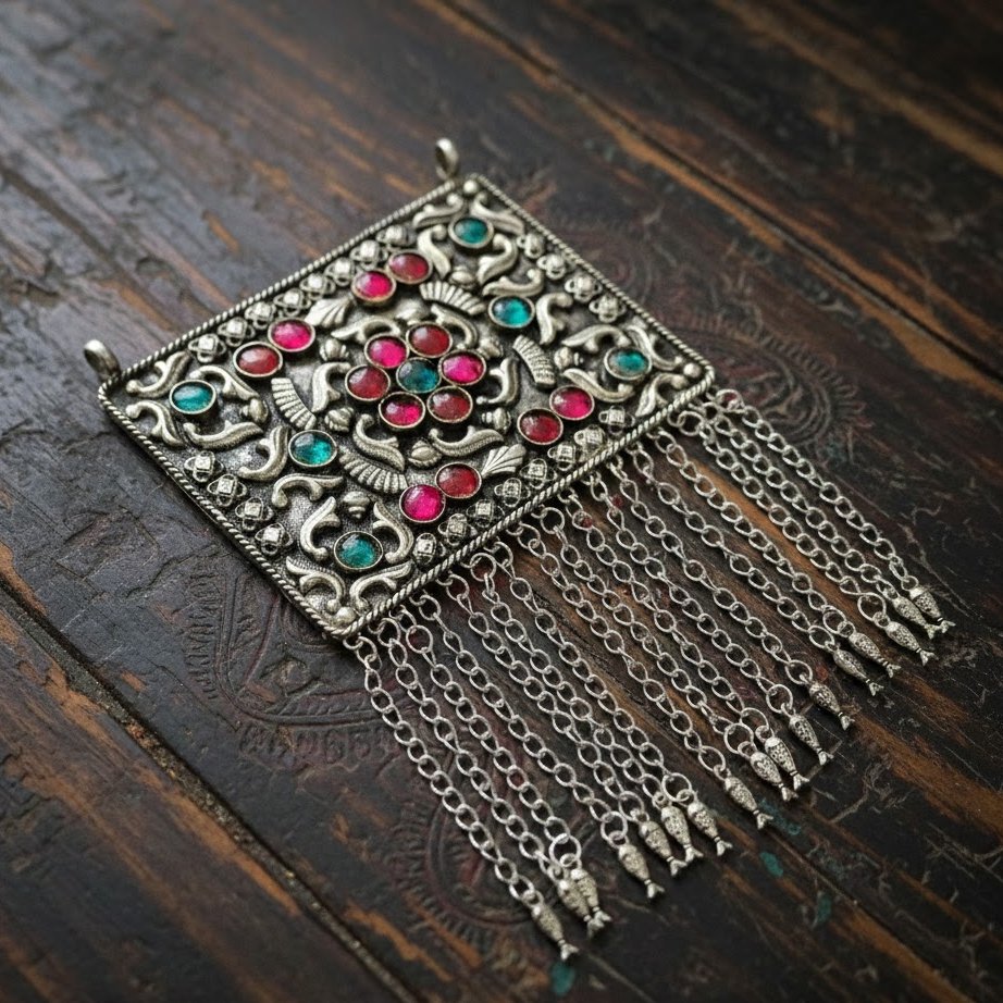 This Antique Silver Tribal Afghan Pendant Replica is inspired by traditional Afghan and nomadic jewelry designs. Crafted with an oxidized silver-tone finish, the pendant showcases intricate tribal patterns that reflect old-world craftsmanship and cultural heritage.