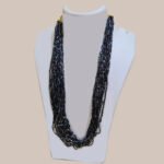 This elegant handcrafted necklace features multiple strands of black glass bugle beads arranged in a beautifully layered torsade design. The long strands naturally drape around the neckline, forming a graceful and eye-catching statement piece.