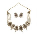 This elegant necklace set features a classic Kundan-inspired design adorned with floral motifs and lustrous pearl strands. The necklace showcases beautifully crafted round floral elements highlighted with clear stones and a rich antique gold finish, complemented by cascading pearl drops that add graceful movement. Paired with matching floral stud earrings, this set offers a timeless blend of traditional charm and refined elegance. Perfect for weddings, festive occasions, and ethnic celebrations, it enhances sarees, lehengas, and anarkali outfits with effortless sophistication.