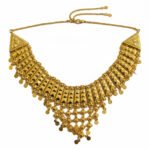 Elegant gold-plated statement necklace featuring a bold traditional design with detailed textured elements and dangling accents. Perfect for weddings, festive occasions, and ethnic wear, this necklace adds a rich, royal touch to sarees and lehengas. Lightweight, adjustable, and designed for a comfortable fit.