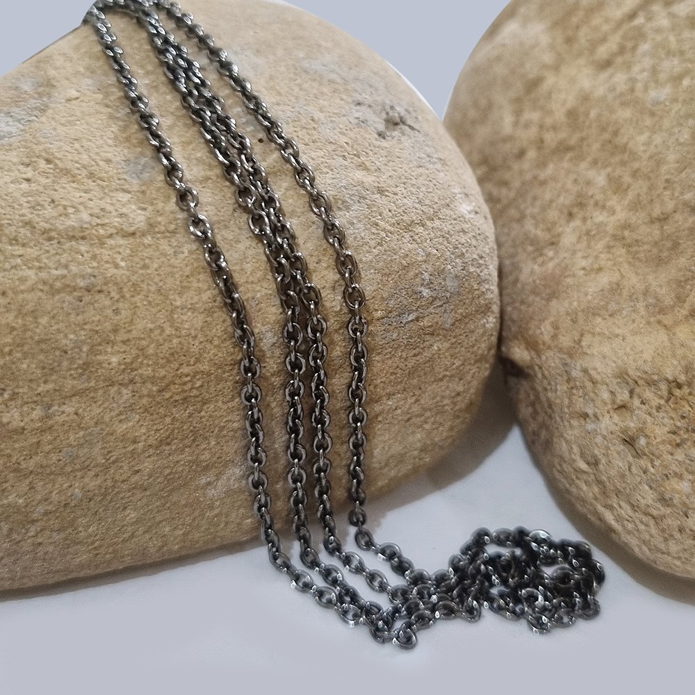 Gunmetal (black) plated jewelry chain in 2mm size, perfect for necklace, bracelet, and pendant making. Durable metal finish with smooth links, ideal for modern and minimalist jewelry designs.