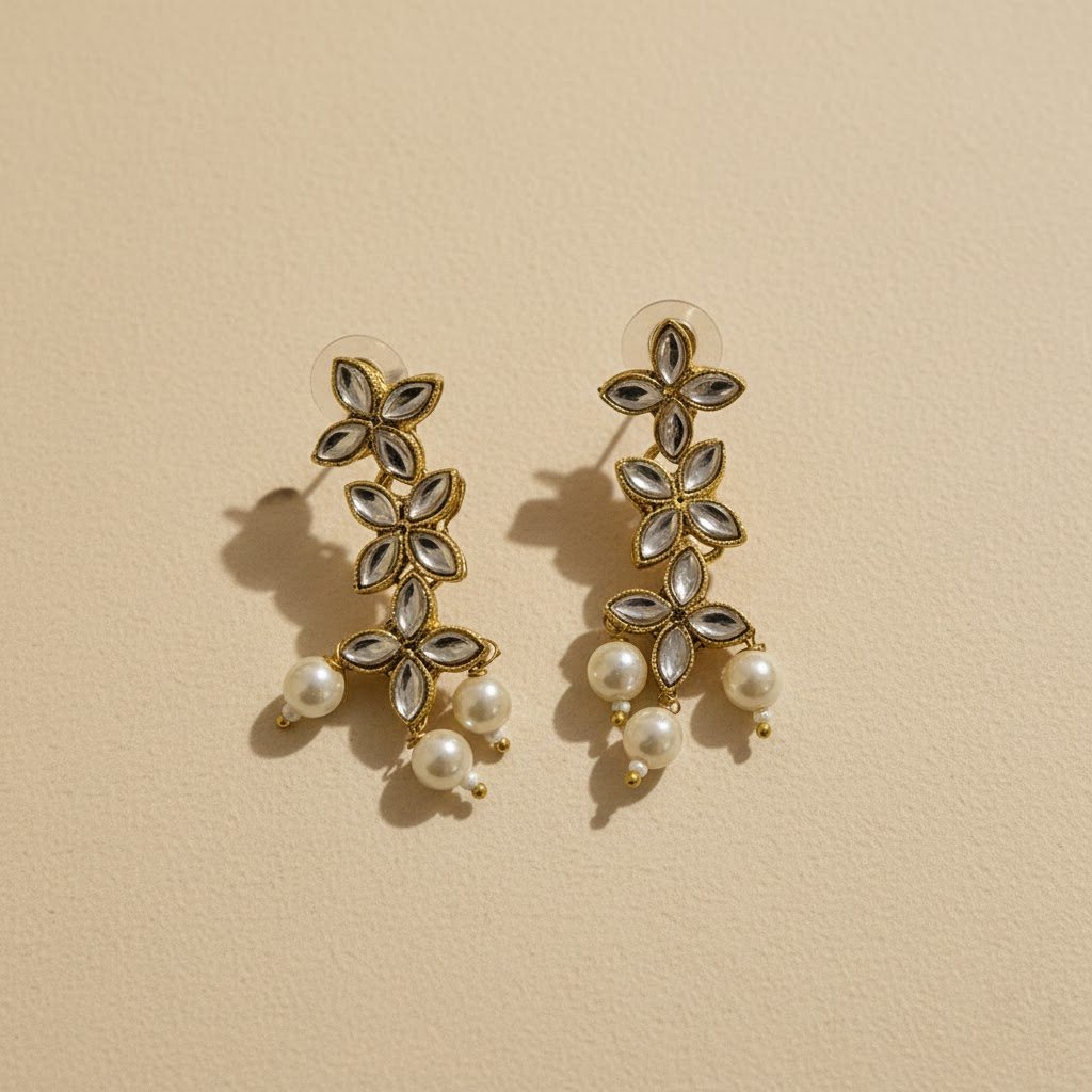 Multi-layer pearl necklace featuring fine white pearl strands paired with a crescent-shaped kundan centerpiece. Finished with a gold-tone setting and classic detailing, this necklace adds timeless charm to festive, bridal, and traditional outfits. Perfect for weddings, receptions, and special occasions.