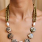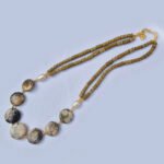 This elegant Agate Stone Beads Necklace is handcrafted using carefully selected natural gemstone beads. Each bead features unique textures, natural color variations, and organic shapes that highlight the beauty of genuine agate stone. The necklace is designed to create a balanced statement look, combining larger centerpiece beads with smaller accent stones. Because natural stones are used, every necklace has its own distinct pattern, making each piece one-of-a-kind. The warm earthy tones and smooth polished finish make this necklace ideal for ethnic wear, casual outfits, boho styling, and festive occasions. Its versatile design allows it to be paired with sarees, kurtis, dresses, or western outfits. Whether worn as a bold statement accessory or layered with other jewelry, this agate necklace adds a natural elegance to any look.