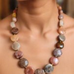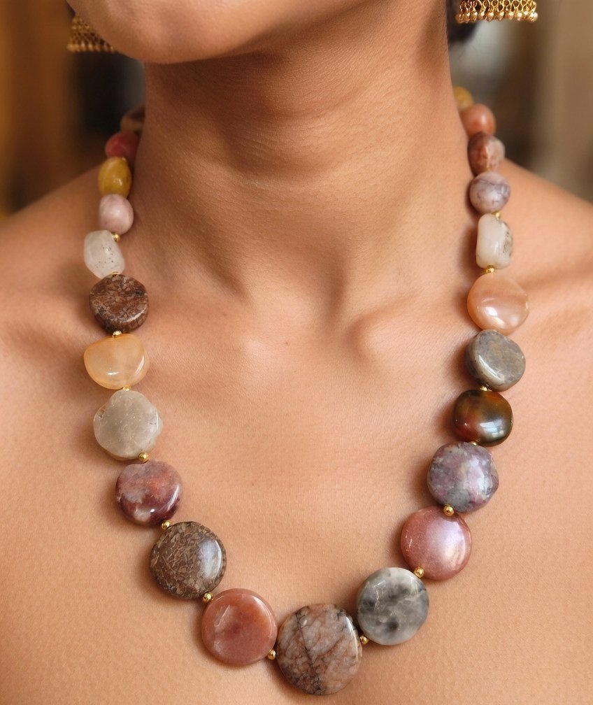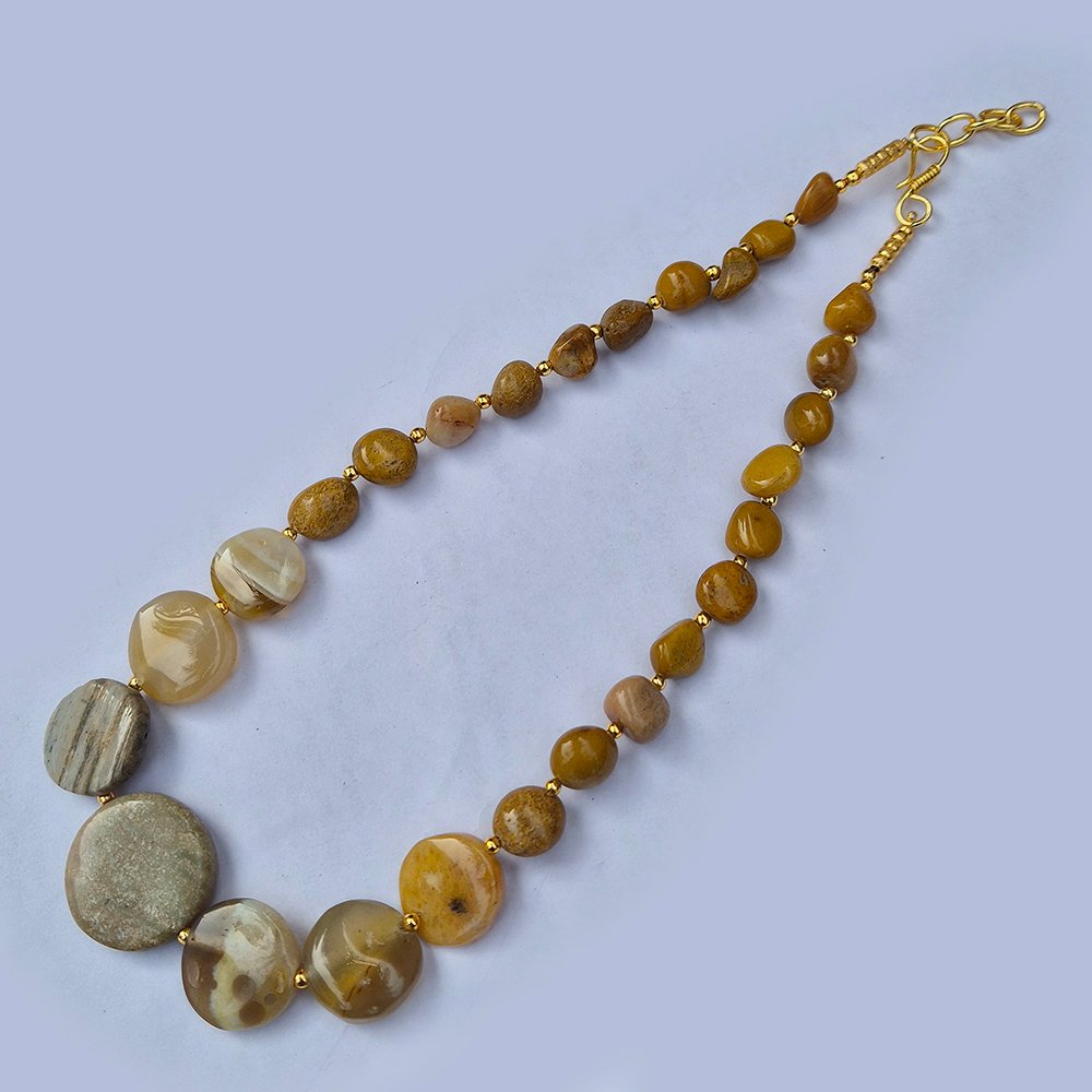 This elegant Agate Stone Beads Necklace is handcrafted using carefully selected natural gemstone beads. Each bead features unique textures, natural color variations, and organic shapes that highlight the beauty of genuine agate stone. The necklace is designed to create a balanced statement look, combining larger centerpiece beads with smaller accent stones. Because natural stones are used, every necklace has its own distinct pattern, making each piece one-of-a-kind. The warm earthy tones and smooth polished finish make this necklace ideal for ethnic wear, casual outfits, boho styling, and festive occasions. Its versatile design allows it to be paired with sarees, kurtis, dresses, or western outfits. Whether worn as a bold statement accessory or layered with other jewelry, this agate necklace adds a natural elegance to any look.