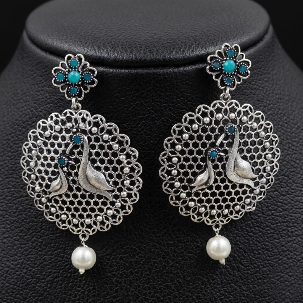 Beautiful oxidized earrings featuring multicolor stones and intricate traditional carving. Perfect for ethnic, festive and boho style looks.