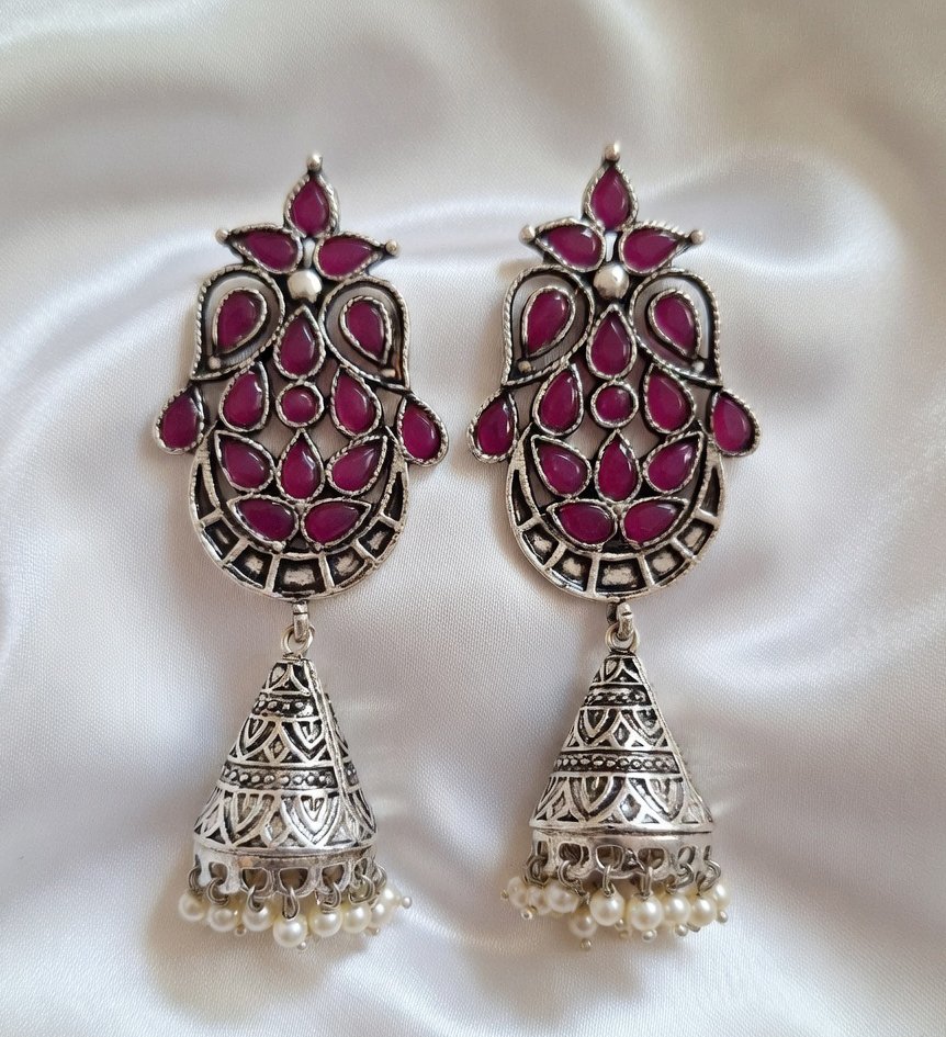 Beautiful oxidized earrings featuring multicolor stones and intricate traditional carving. Perfect for ethnic, festive and boho style looks.