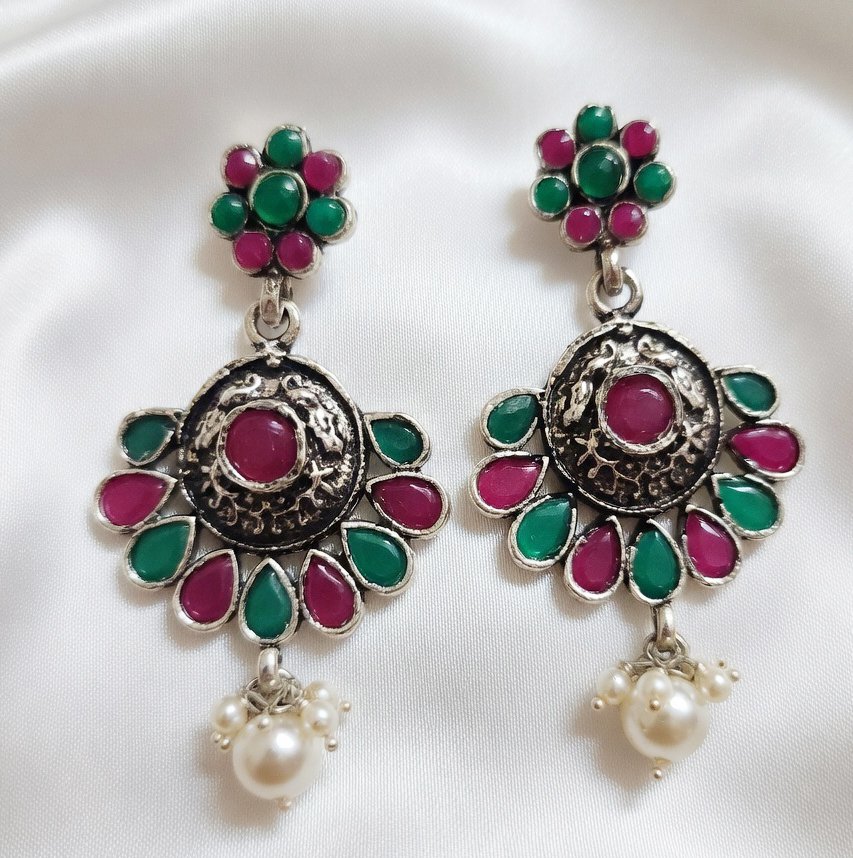 Beautiful oxidized earrings featuring multicolor stones and intricate traditional carving. Perfect for ethnic, festive and boho style looks.