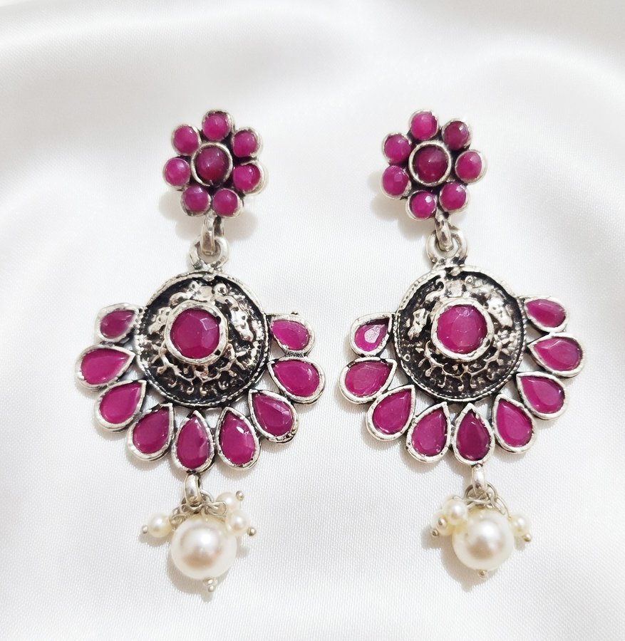 Beautiful oxidized earrings featuring multicolor stones and intricate traditional carving. Perfect for ethnic, festive and boho style looks.