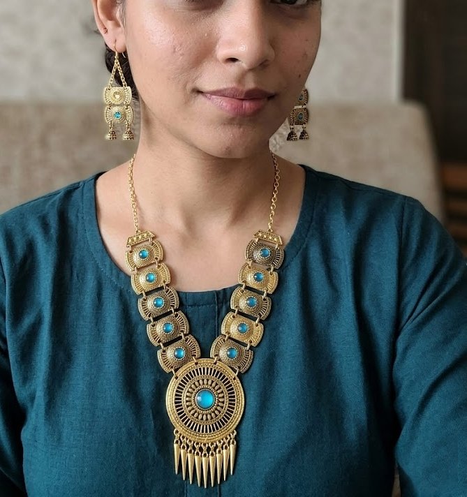 Beautiful oxidized statement necklace inspired by traditional Indian tribal and boho jewelry styles. Designed with antique Gold finish, intricate carvings, beads, and detailed pendants, perfect for ethnic, festive, and casual styling.