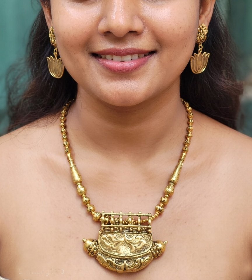 Beautiful oxidized statement necklace inspired by traditional Indian tribal and boho jewelry styles. Designed with antique Gold finish, intricate carvings, beads, and detailed pendants, perfect for ethnic, festive, and casual styling.
