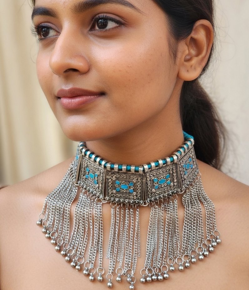 Beautiful oxidized statement necklace inspired by traditional Indian tribal and boho jewelry styles. Designed with antique silver finish, intricate carvings, beads, and detailed pendants, perfect for ethnic, festive, and casual styling.