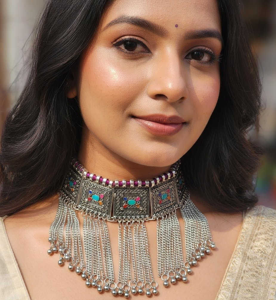 Beautiful oxidized statement necklace inspired by traditional Indian tribal and boho jewelry styles. Designed with antique silver finish, intricate carvings, beads, and detailed pendants, perfect for ethnic, festive, and casual styling.