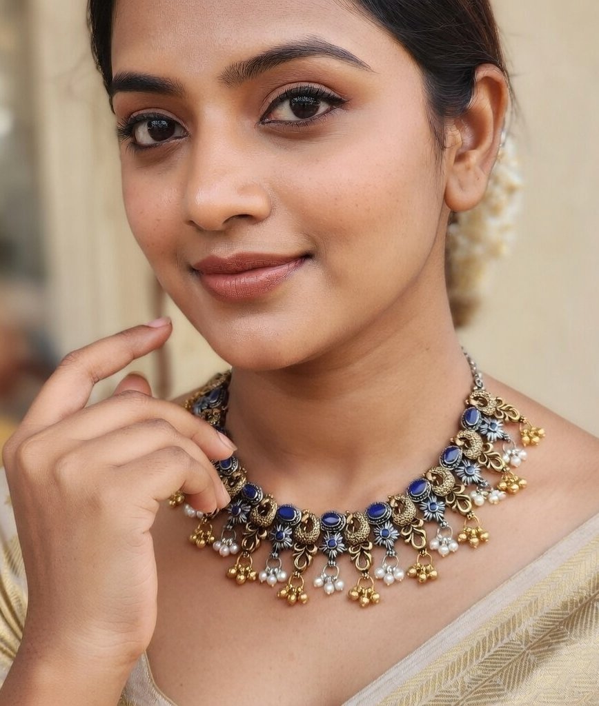 Add a bold ethnic charm to your jewelry collection with this stunning oxidized tribal statement necklace. Inspired by traditional Indian craftsmanship, this necklace features intricate carvings, vintage antique silver finish, decorative beads, and detailed pendants that create a striking ethnic look. The unique tribal and bohemian design makes it perfect for pairing with sarees, kurtis, ethnic dresses, and fusion outfits. Lightweight yet eye-catching, this necklace enhances your overall style with a timeless vintage appeal. Whether worn for festivals, weddings, parties, or casual ethnic wear, this statement necklace beautifully blends traditional artistry with modern fashion. The oxidized finish gives it a classic handcrafted look that never goes out of style. This versatile necklace is ideal for women who love bold ethnic jewelry, boho fashion, and antique silver accessories.