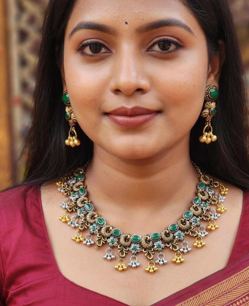Add a bold ethnic charm to your jewelry collection with this stunning oxidized tribal statement necklace. Inspired by traditional Indian craftsmanship, this necklace features intricate carvings, vintage antique silver finish, decorative beads, and detailed pendants that create a striking ethnic look. The unique tribal and bohemian design makes it perfect for pairing with sarees, kurtis, ethnic dresses, and fusion outfits. Lightweight yet eye-catching, this necklace enhances your overall style with a timeless vintage appeal. Whether worn for festivals, weddings, parties, or casual ethnic wear, this statement necklace beautifully blends traditional artistry with modern fashion. The oxidized finish gives it a classic handcrafted look that never goes out of style. This versatile necklace is ideal for women who love bold ethnic jewelry, boho fashion, and antique silver accessories.