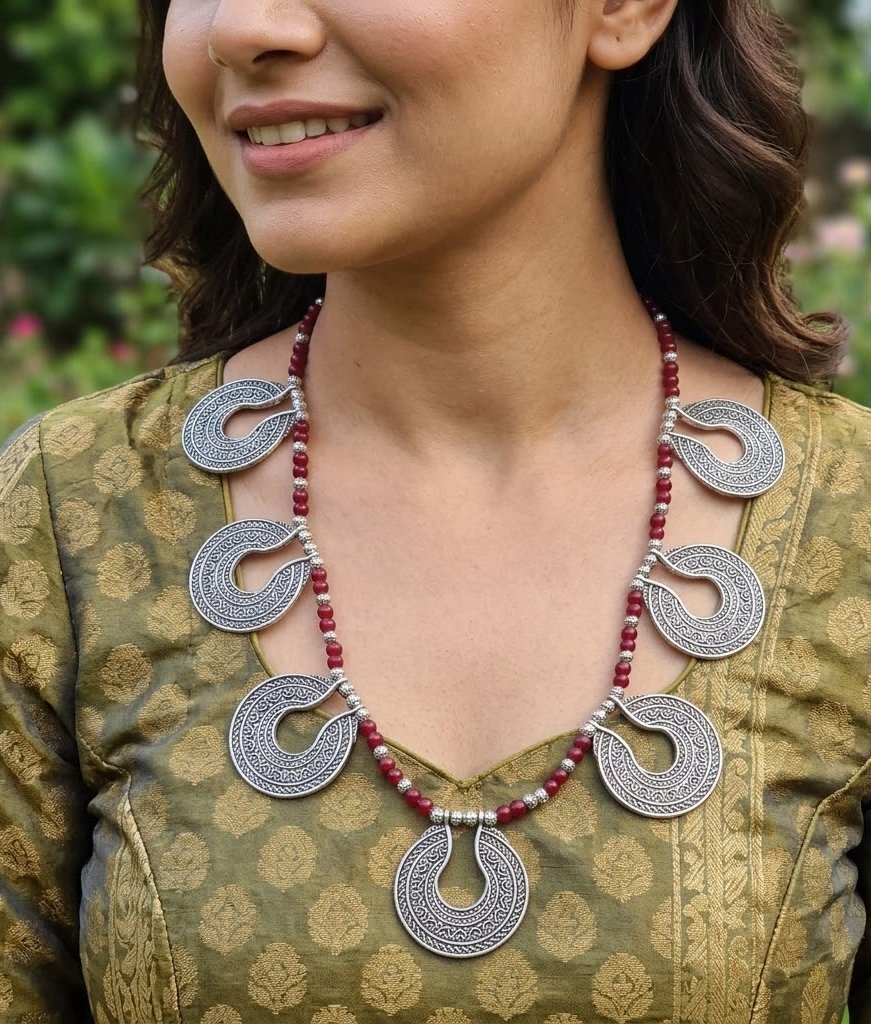 Beautiful oxidized statement necklace inspired by traditional Indian tribal and boho jewelry styles. Designed with antique silver finish, intricate carvings, beads, and detailed pendants, perfect for ethnic, festive, and casual styling.