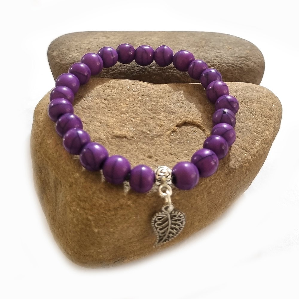 Purple beaded 8mm beads bracelets with charms, stretchable easy to wear in all hand